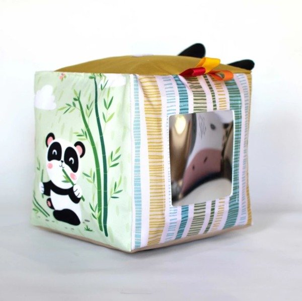 Cubo 20x20x20 cm con espejo blando y argolla de madera natural, cintas coloridas, y cascabel al agitar, lleva un personaje de osito tipo muñeco con abrojo que se adhiere al cubo para no extraviarlo.