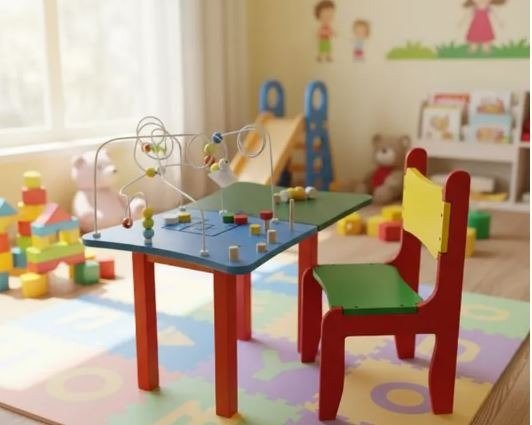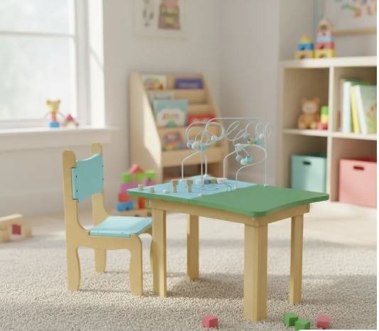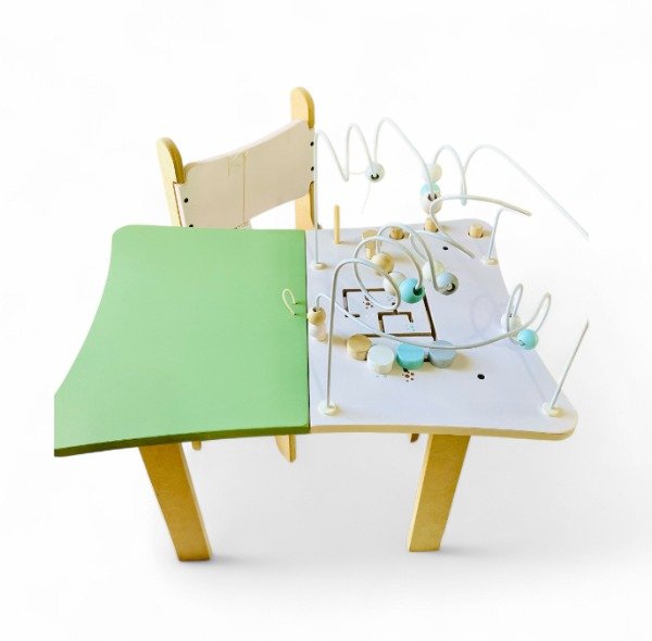 Mesa de actividades didácticas de 5 juegos, con pizarra y cajón de guardado + 2 sillitas