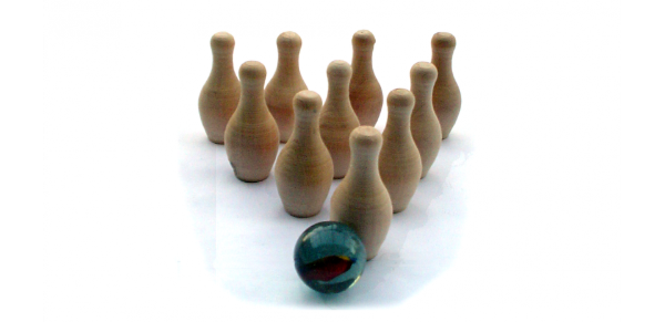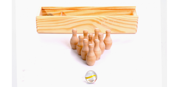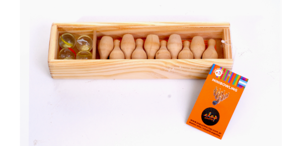 Caja con pinos de minibowling y 4 canicas que permiten jugar al bowling en cualquier espacio.